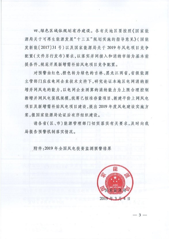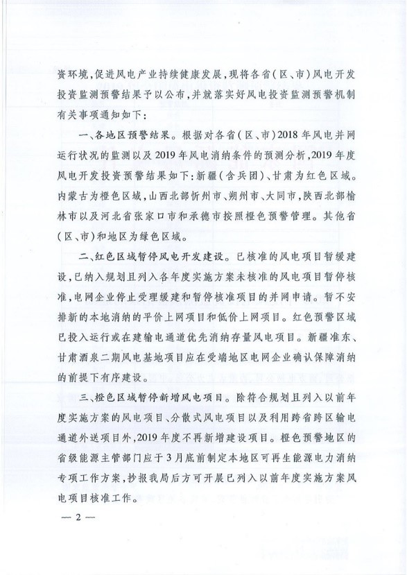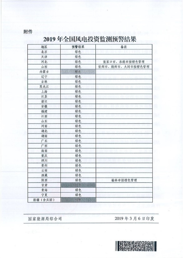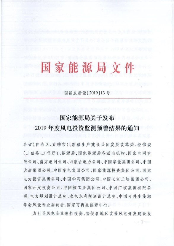关于发布2019年度风电投资监测预警结果的通知